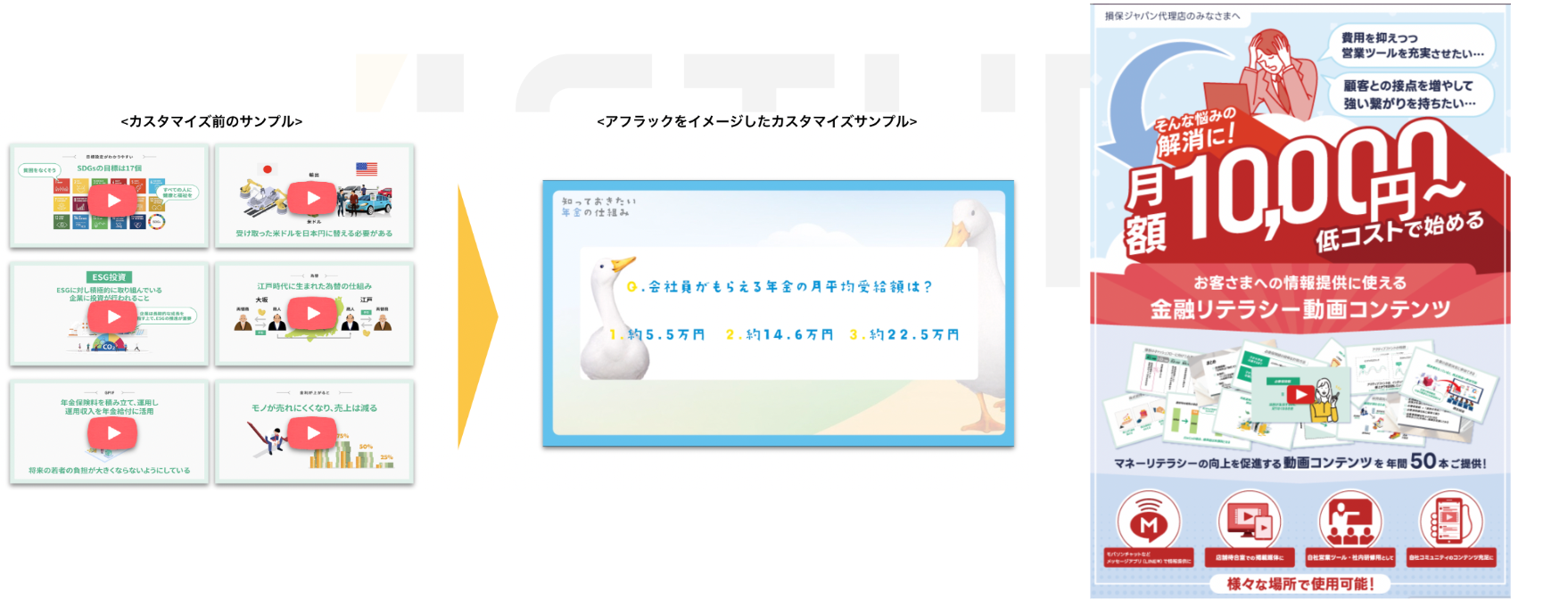 ABCash社とともに、保険代理店向けのCRM用サービスを開発。ABCash社が保有する金融教育動画をSTUN社の制作スキルで代理店様向けにカスタマイズし、代理店様が顧客との接点でご活用いただけるコンテンツの提供を行なっています。