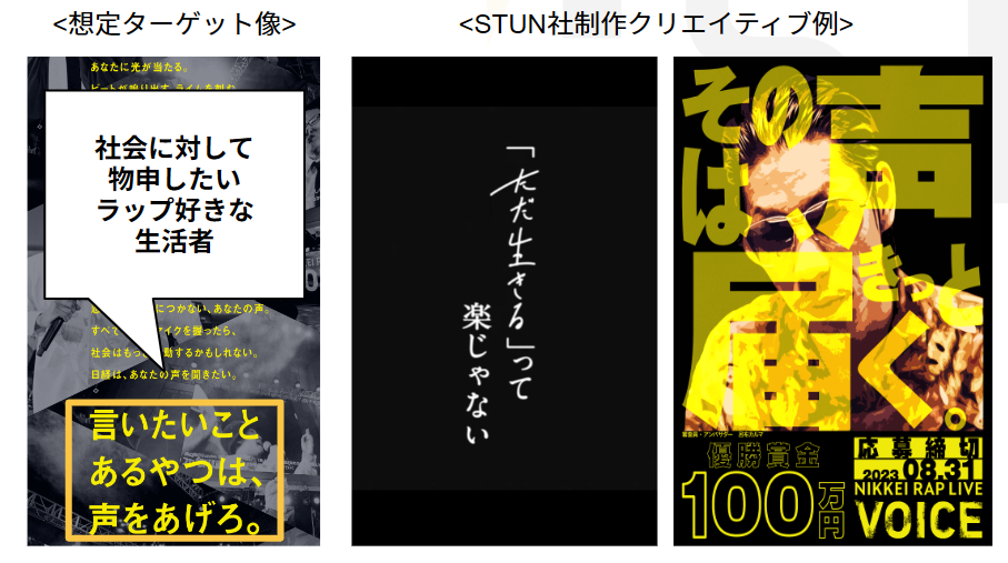 「NIKKEI RAP LIVE VOICE」というイベントのプロモーションのご依頼。社会やビジネスシーンで感じることや訴えたいことをラップで表現し、一般参加者からの投稿を募る形式で実施されたイベント。このプロジェクトの目的は、現代社会におけるリアルな思いや出来事を広く社会に発信することです。